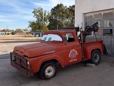 Stop by Walnut RV Park in Vega, Texas, for a fun, nostalgic photo opportunity! Meet RV Parker the Third, our cheerful 1960 Ford F-100 tow truck with a friendly face painted on the windshield. While he may remind you of a certain famous animated tow truck, RV Parker the Third is all his own personality!